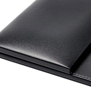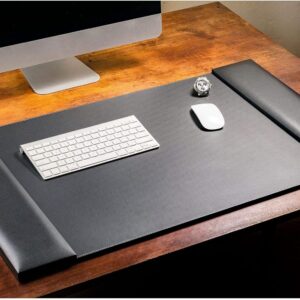 This top-grain black leather 34 x 20 desk mat features outward folding side rails on both sides. The space under the left side rail stores business cards, and the space under the right one holds pens, paper clips and other small stationery items. The leatherette writing surface provides a sturdy and easy to clean writing surface. Designed with high quality components, this Dacasso desk pad will last for years to come.