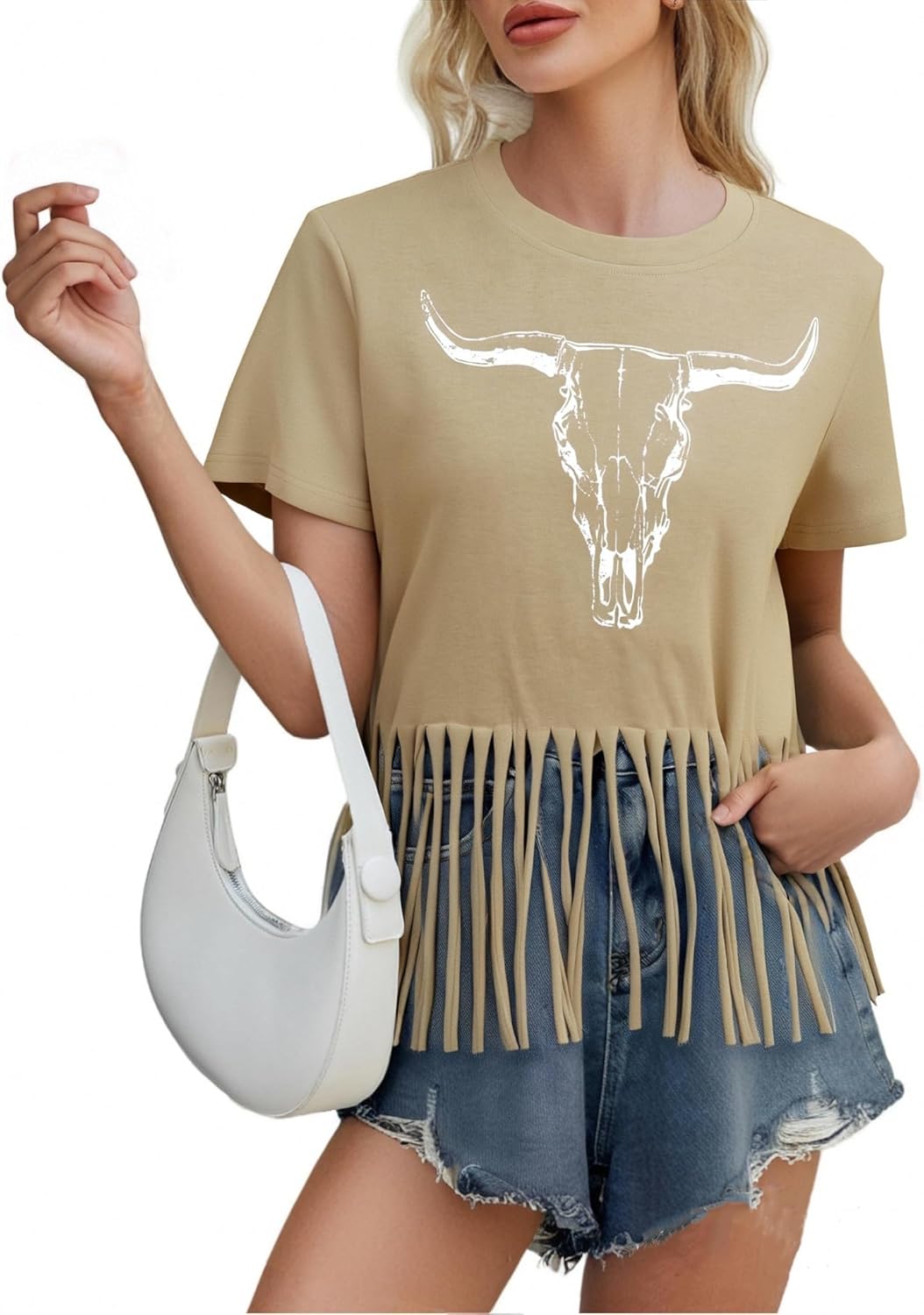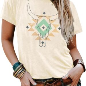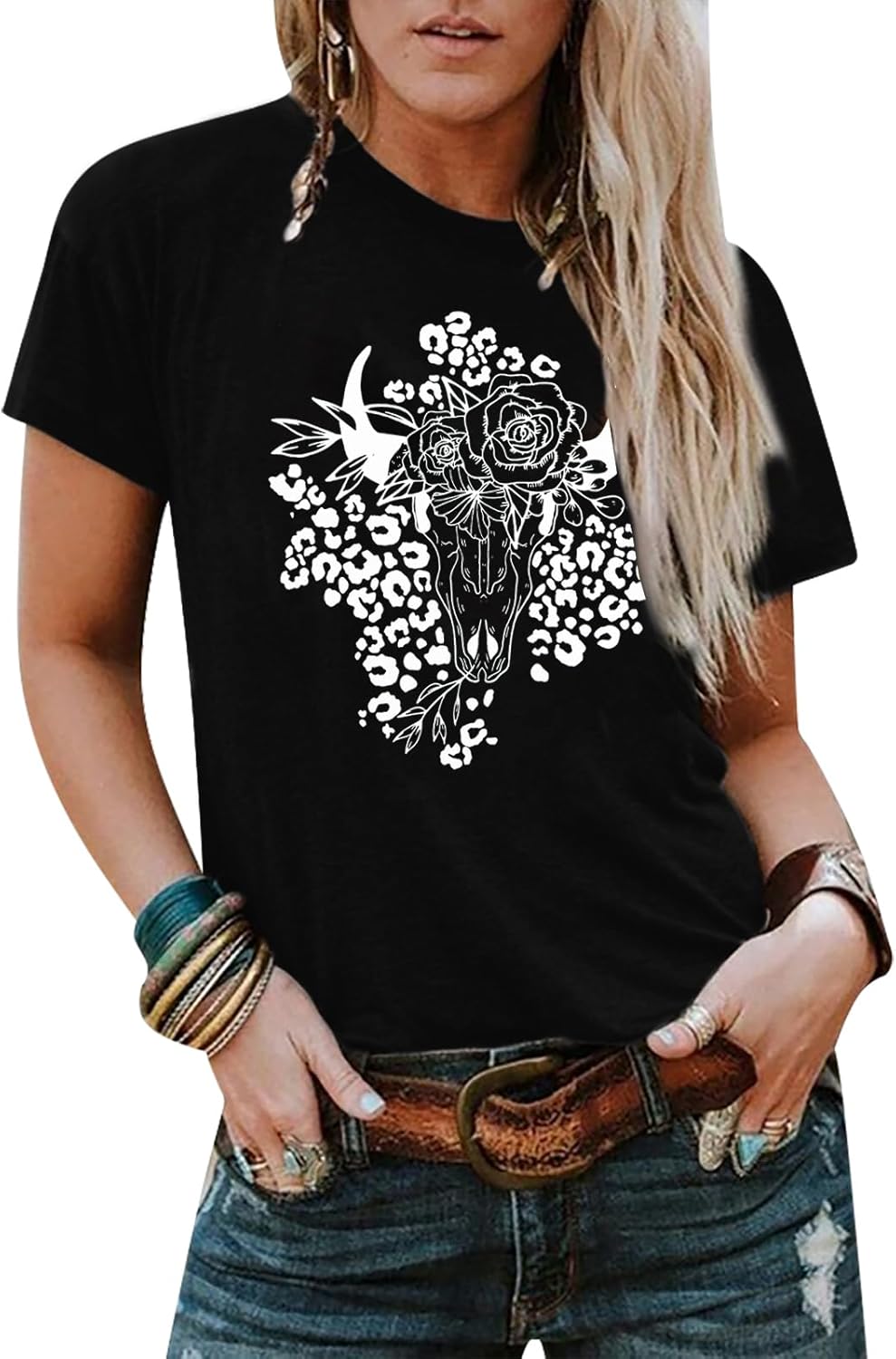 Women Boho Cow Skull Rodeo T-Shirt Vintage Western Graphic Tee Top Short Sleeve