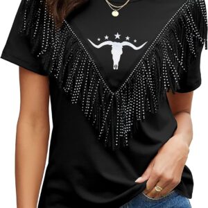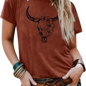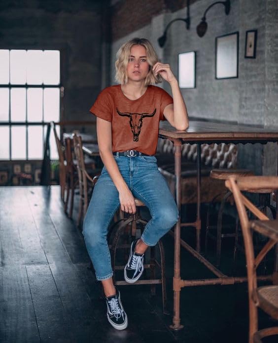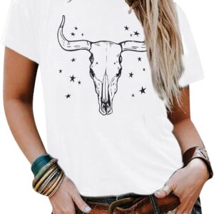 Rodeo Cow Skull Shirts for Women Vintage Western Bull Skull Graphic T-Shirt