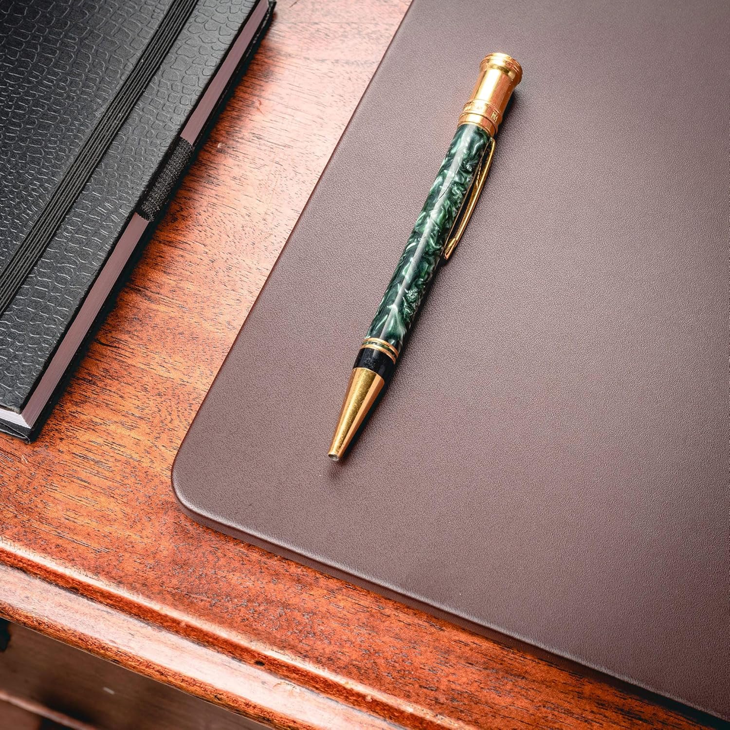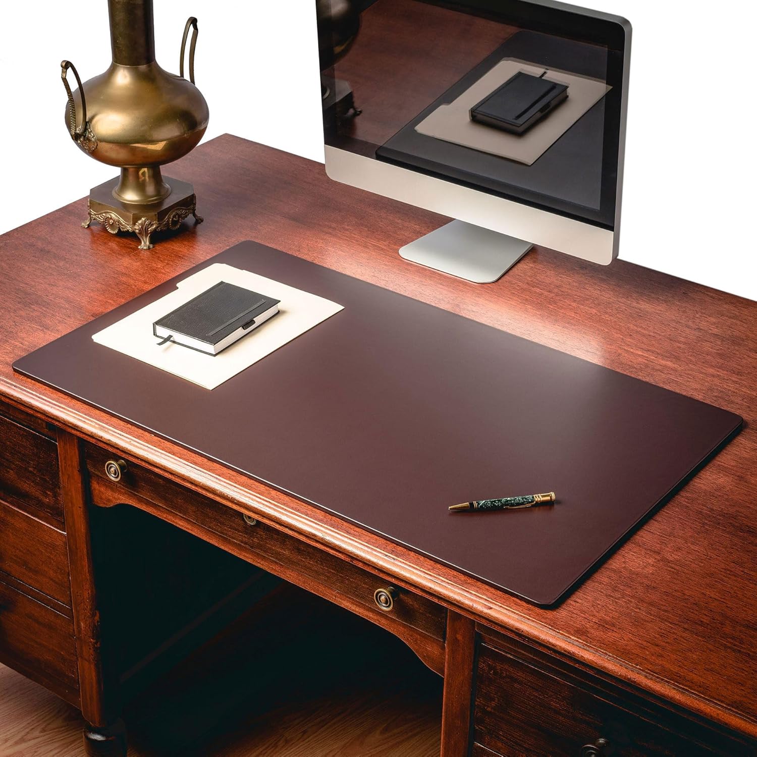 - LUXURY ADDITION TO THE OFFICE SETTINGS: Give your desk some personality with this great top-grain leather pad! Featuring a clean, open work space and luxurious writing surface, this chocolate brown leather desk pad enhances both form and function in your office. Built with a rigid internal core and gentle felt backing, this durable 38"x24" desk pad adds a buffer between your expensive furniture and the marks and scratches of daily use. The sleek, rail-less design is elegant and classic, and the rich chocolate brown color adds warmth to any office setting.