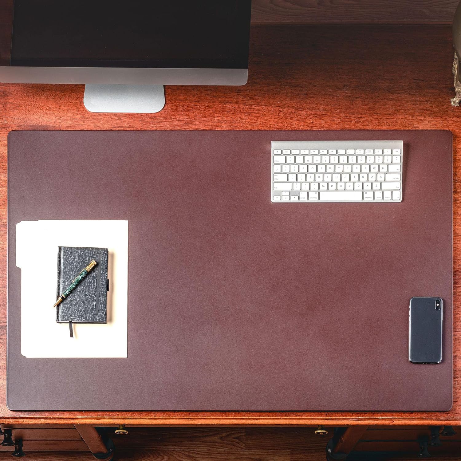 - DIMENSIONS: This chocolate brown leather desk mat measures 38” x 24” x 0.25.