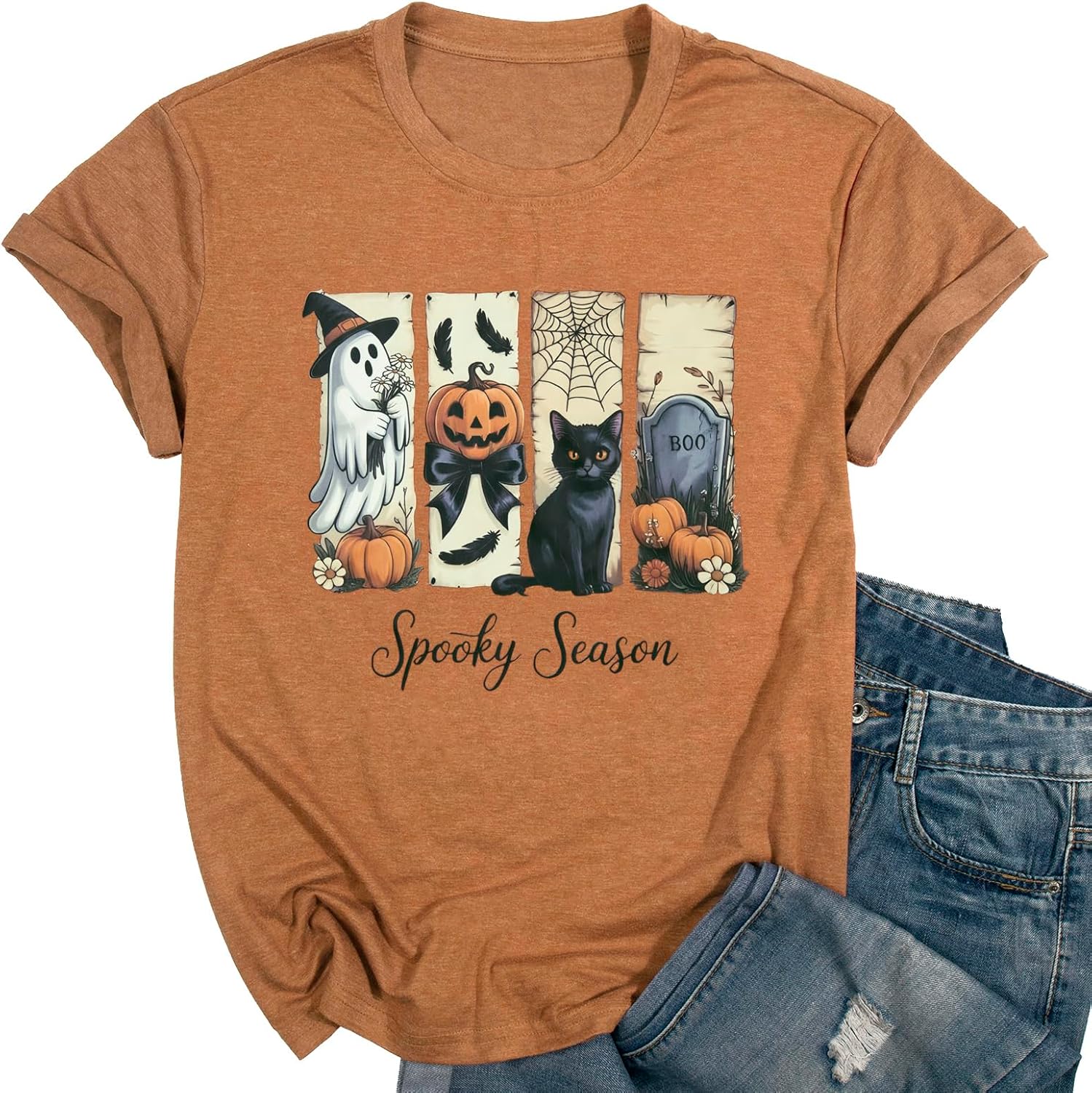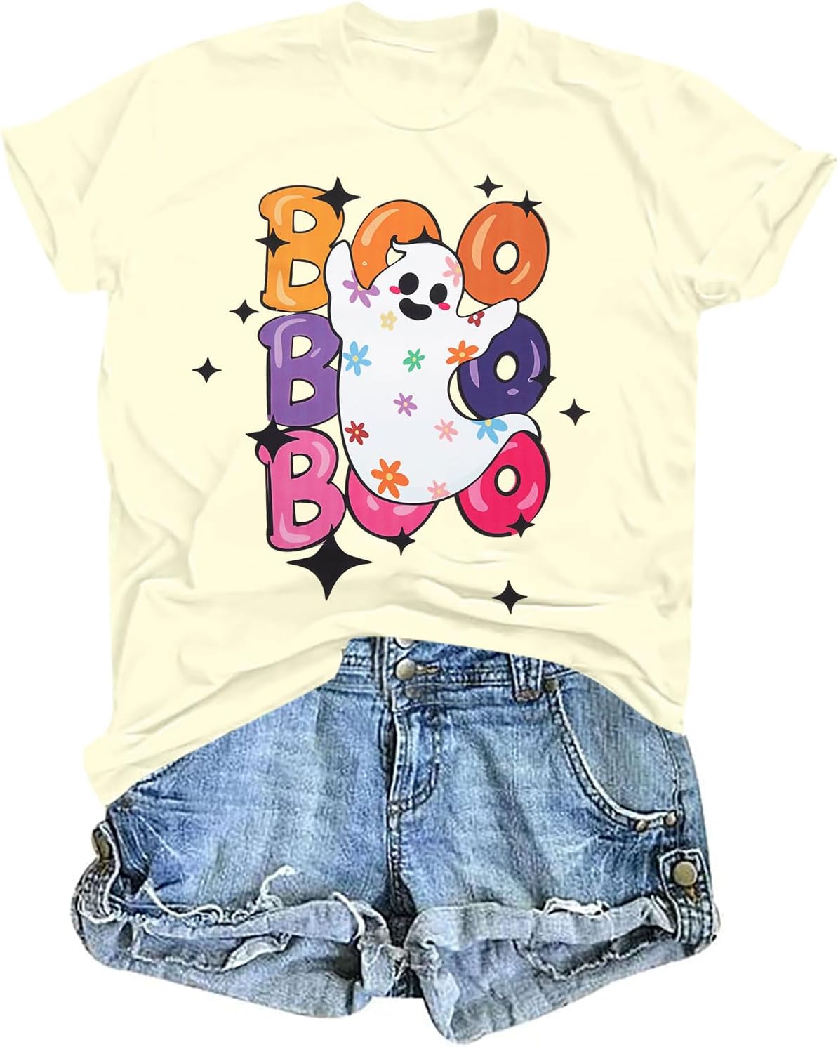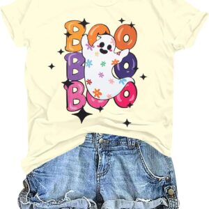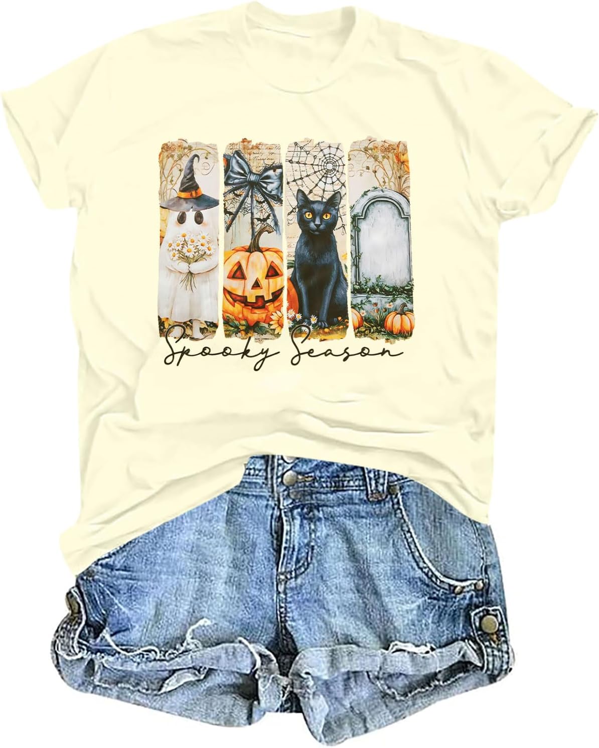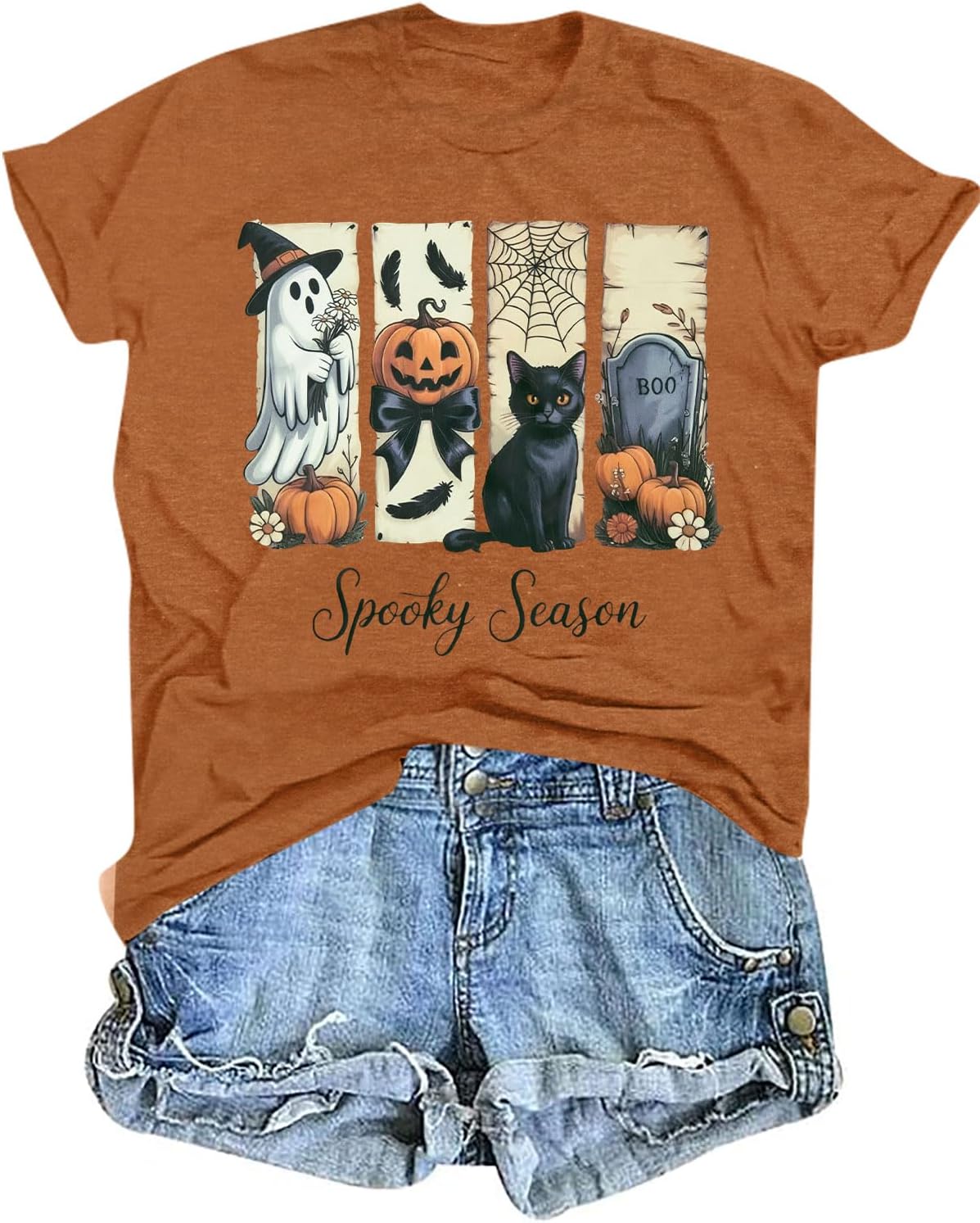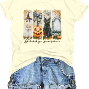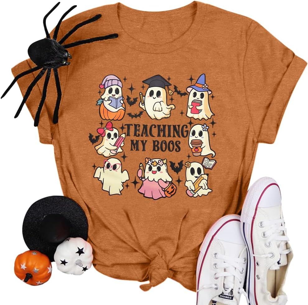 Halloween Teacher Shirts for Women Reading Books T-Shirt Funny Spooky Bookish Tee Halloween Short Sleeve Tops