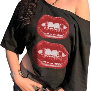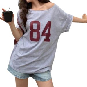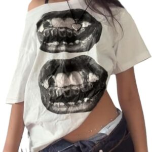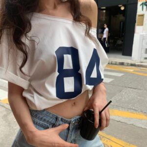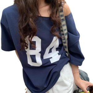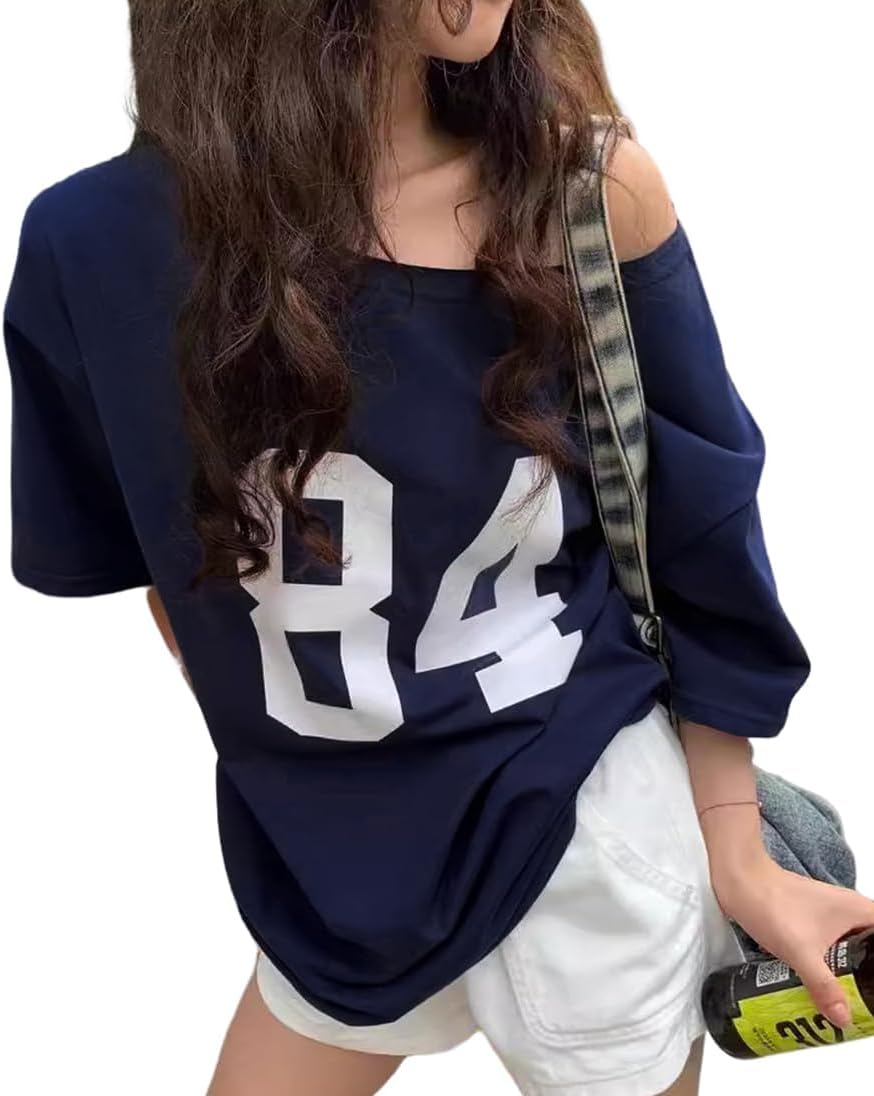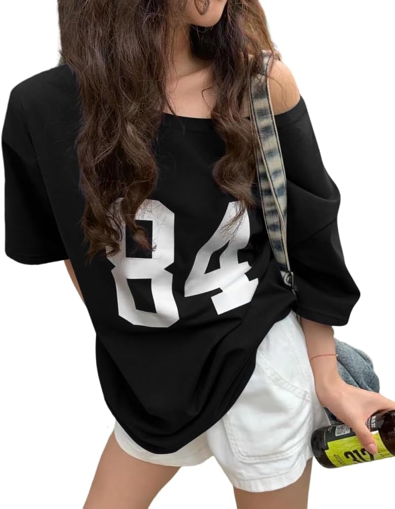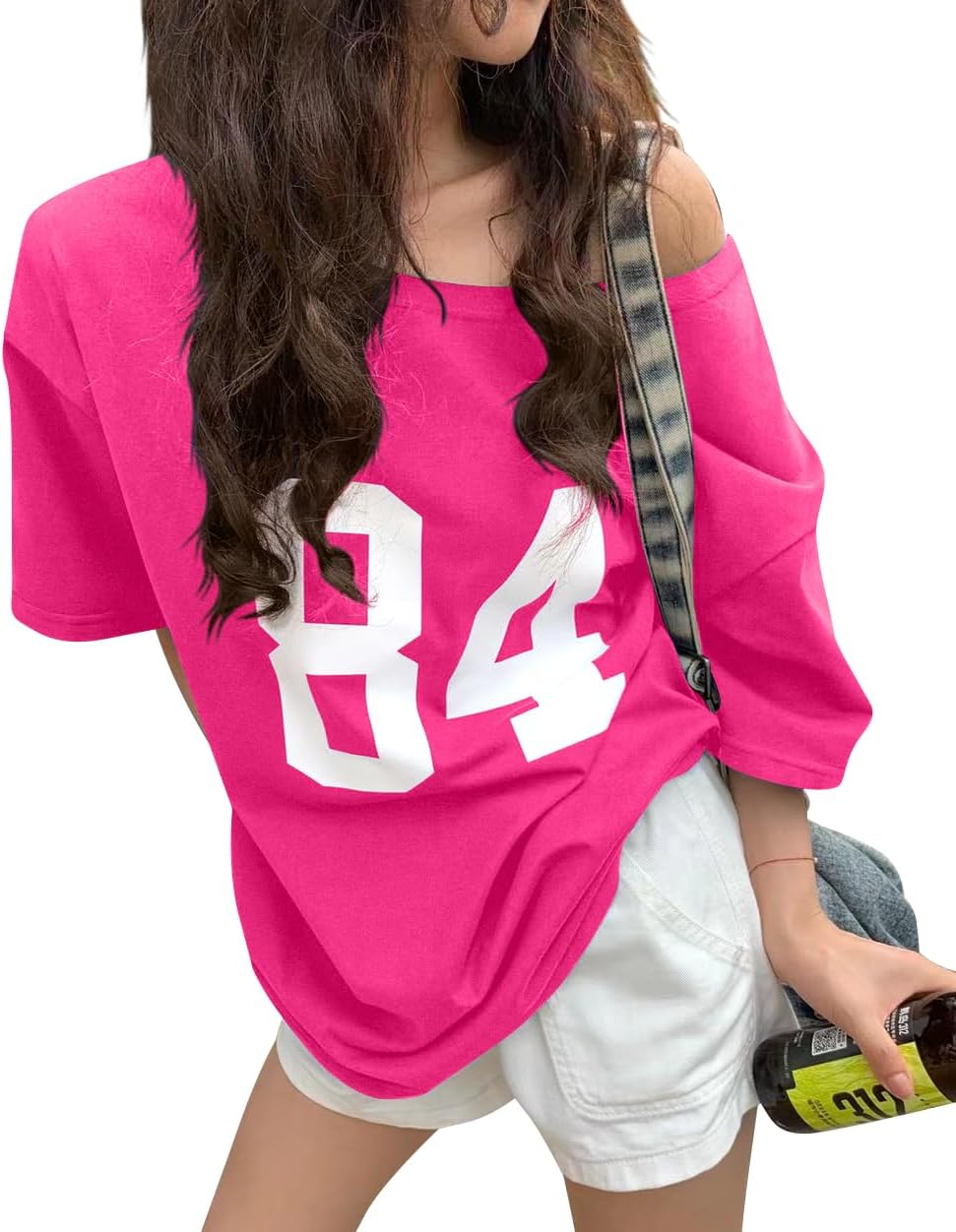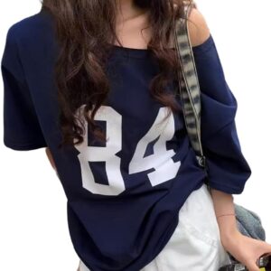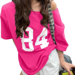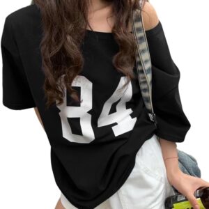 Pinclodly Off The Shoulder Tops for Women Short Sleeve Y2K Jersey Number Graphic Oversized Tshirts E-Girl Tees