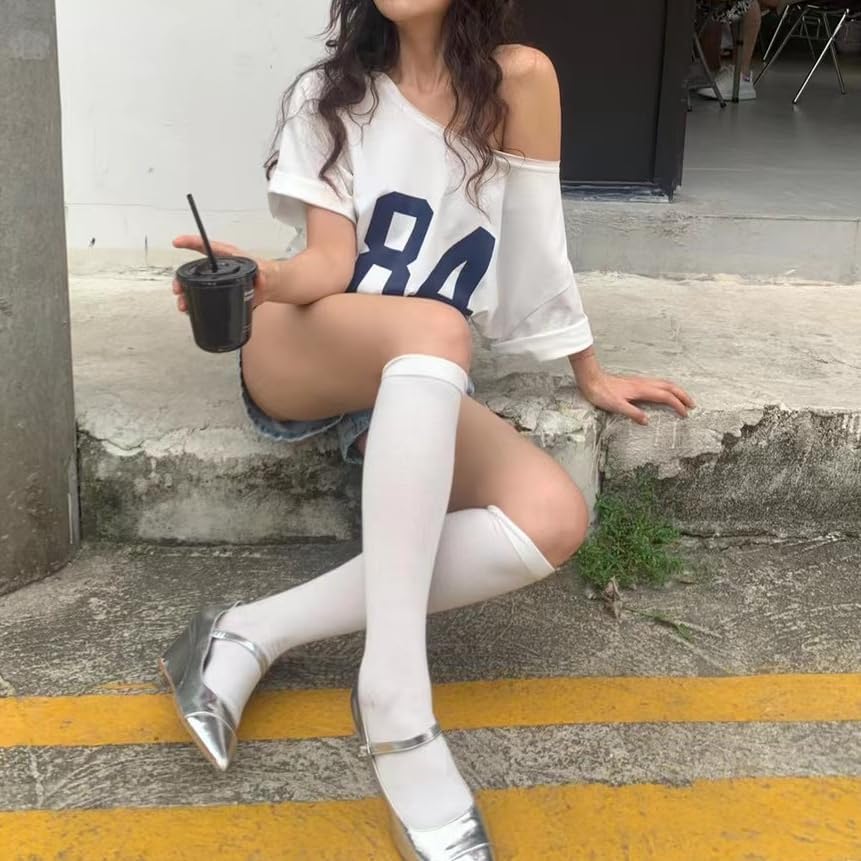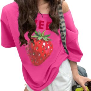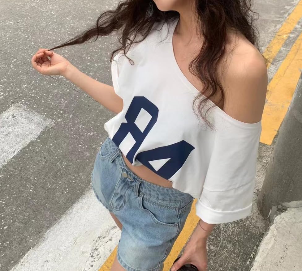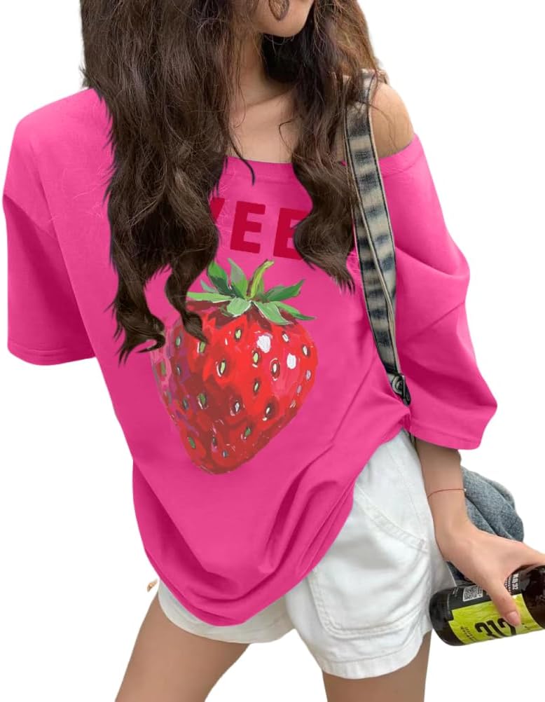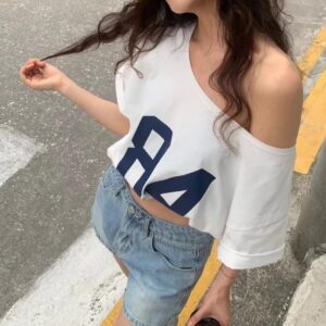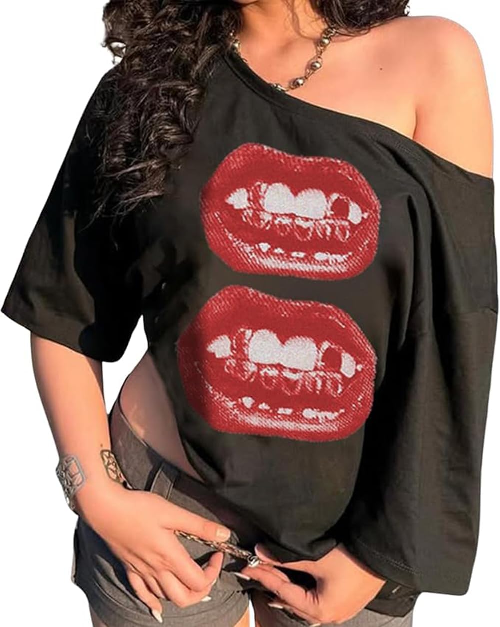 Pinclodly Off The Shoulder Tops for Women Short Sleeve Y2K Jersey Number Graphic Oversized Tshirts E-Girl Tees