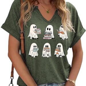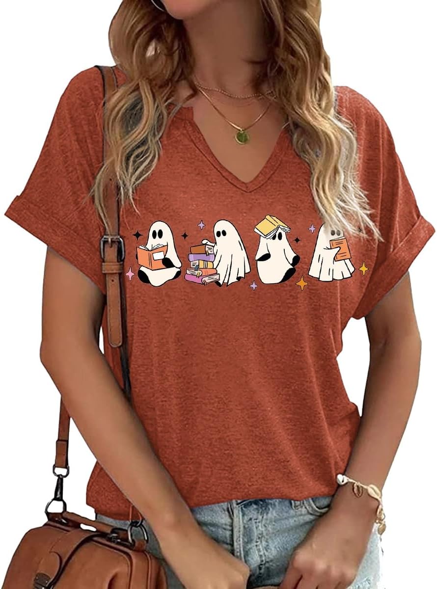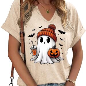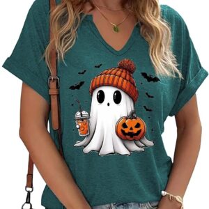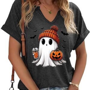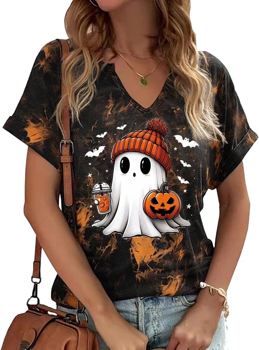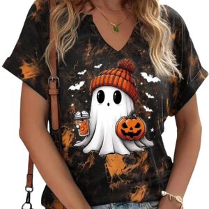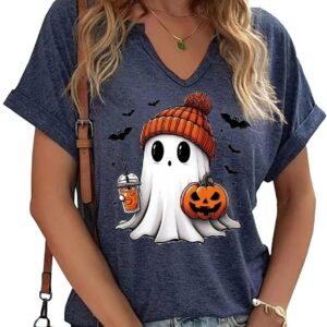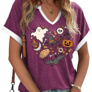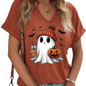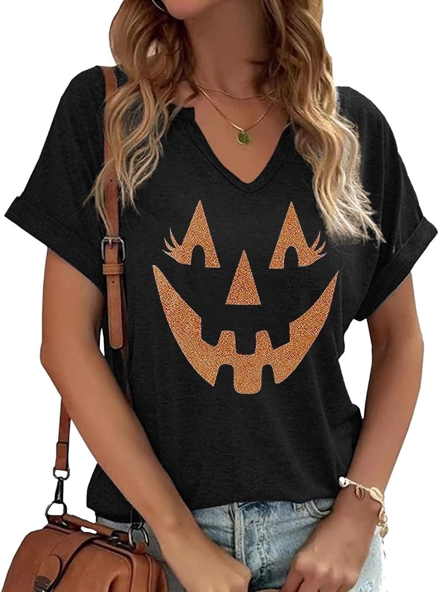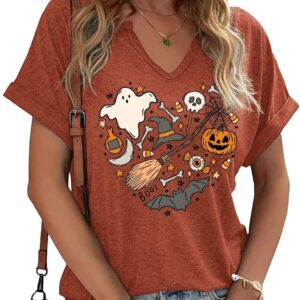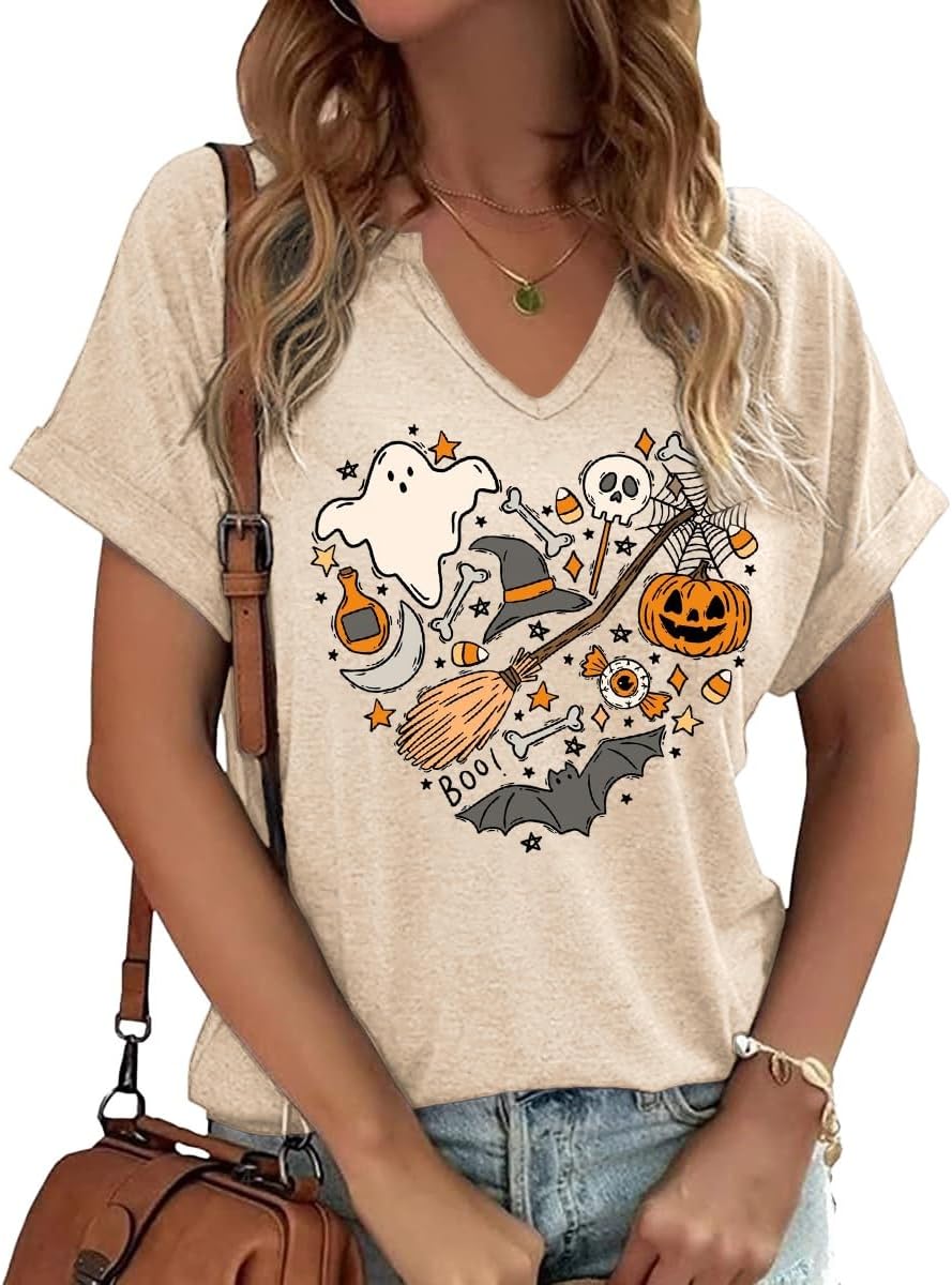 Women Fall Halloween Doodles V Neck Shirt Funny Family Party Celebration Short Sleeve Tee