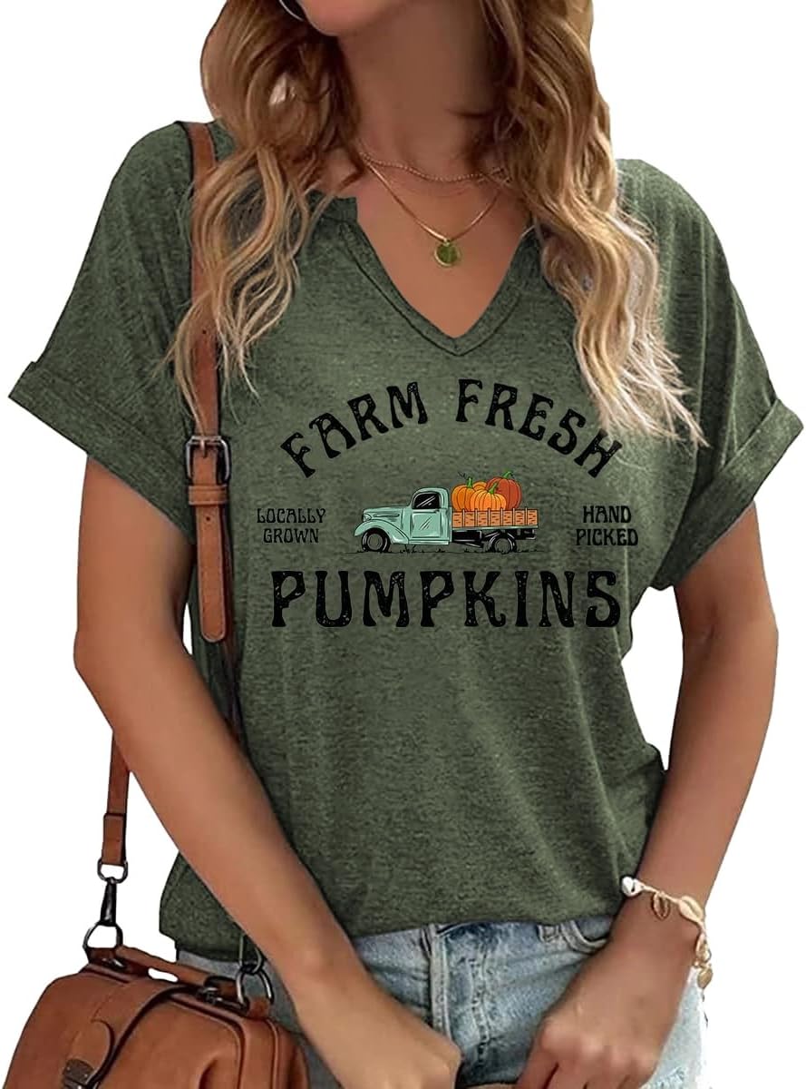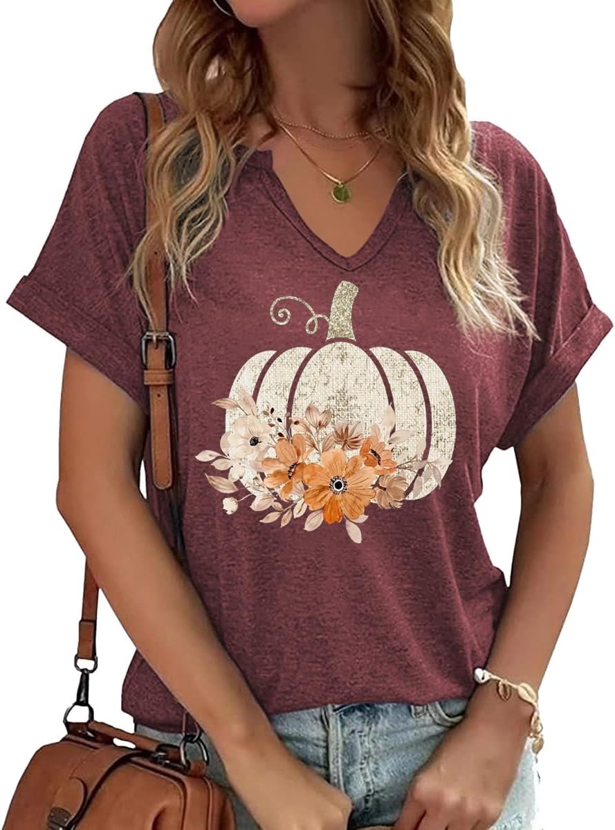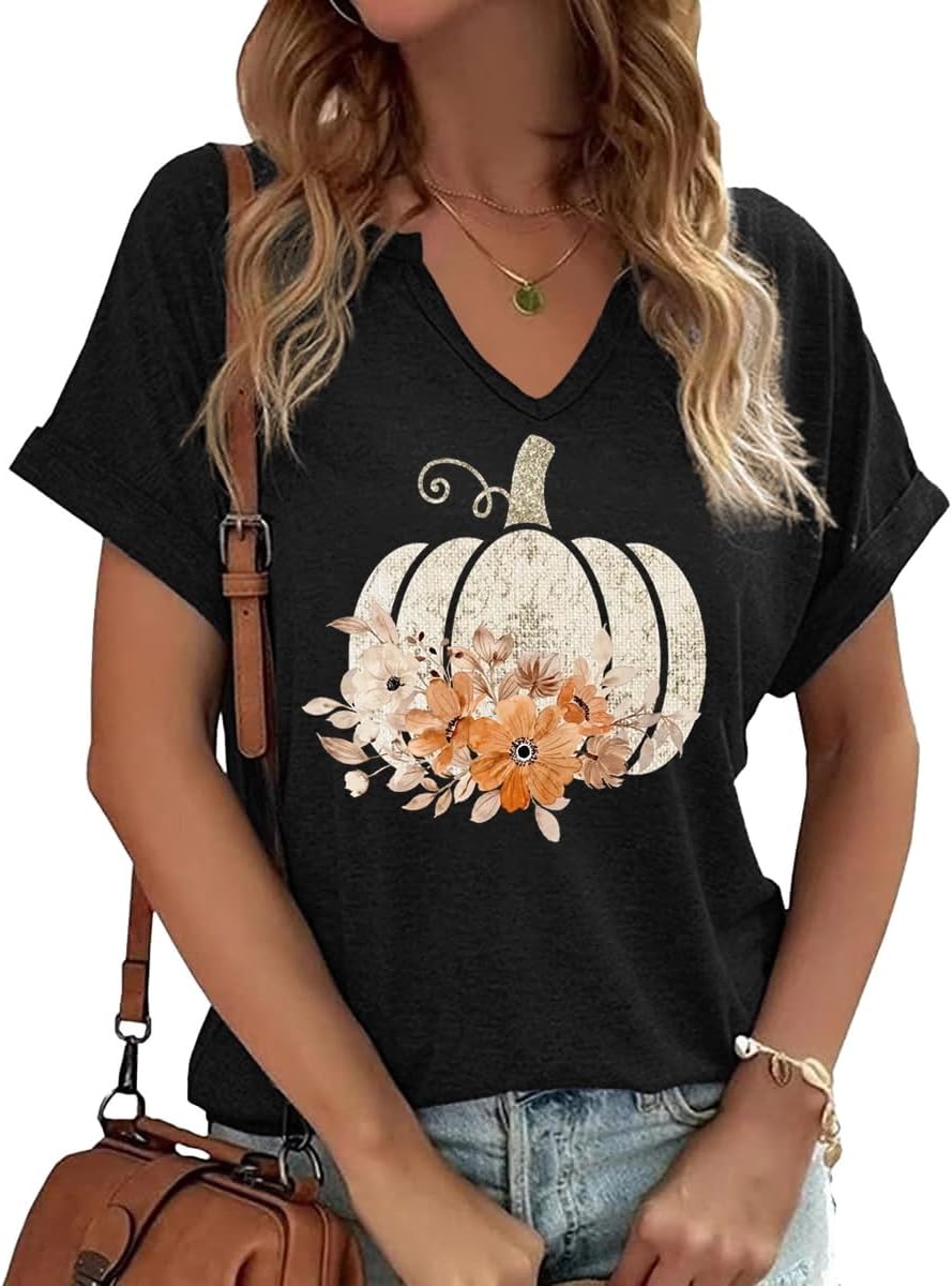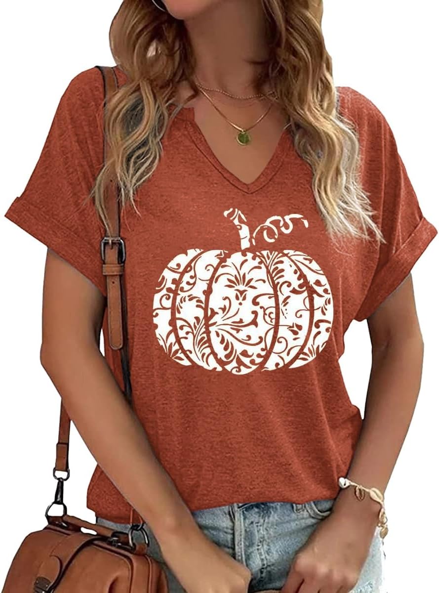 Fall Pumpkin Graphic V Neck Tee Tops