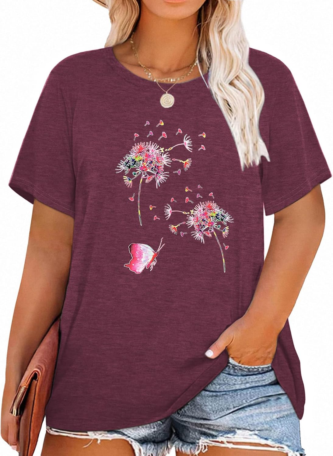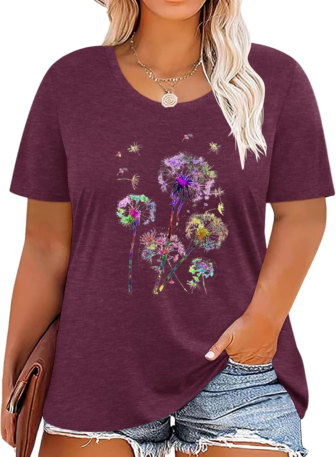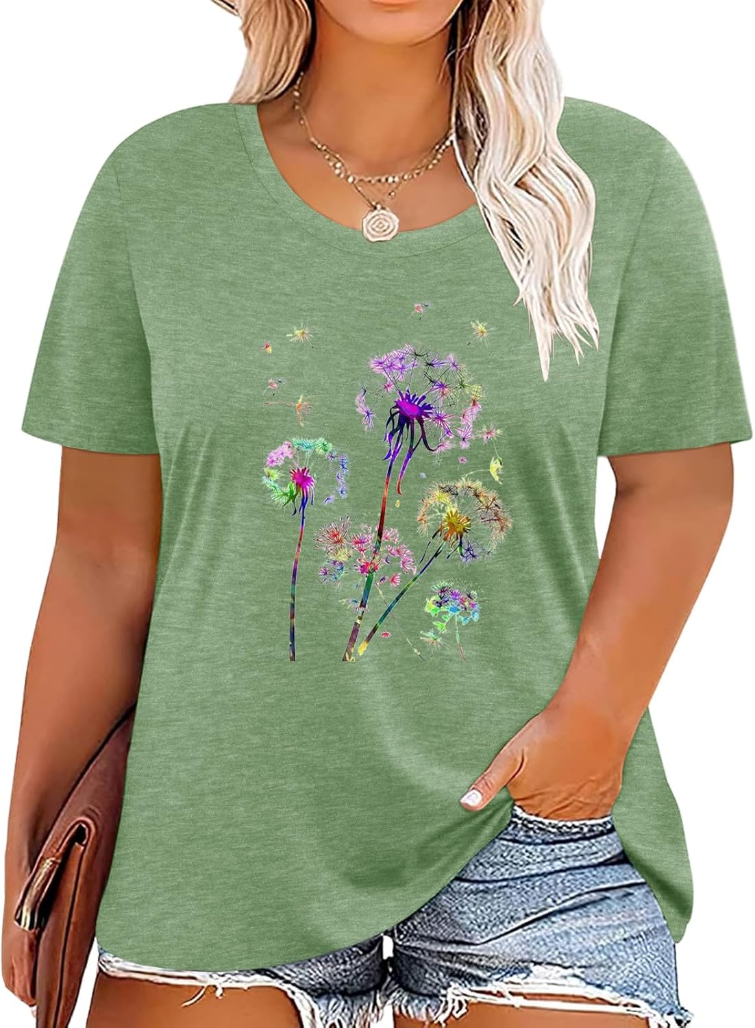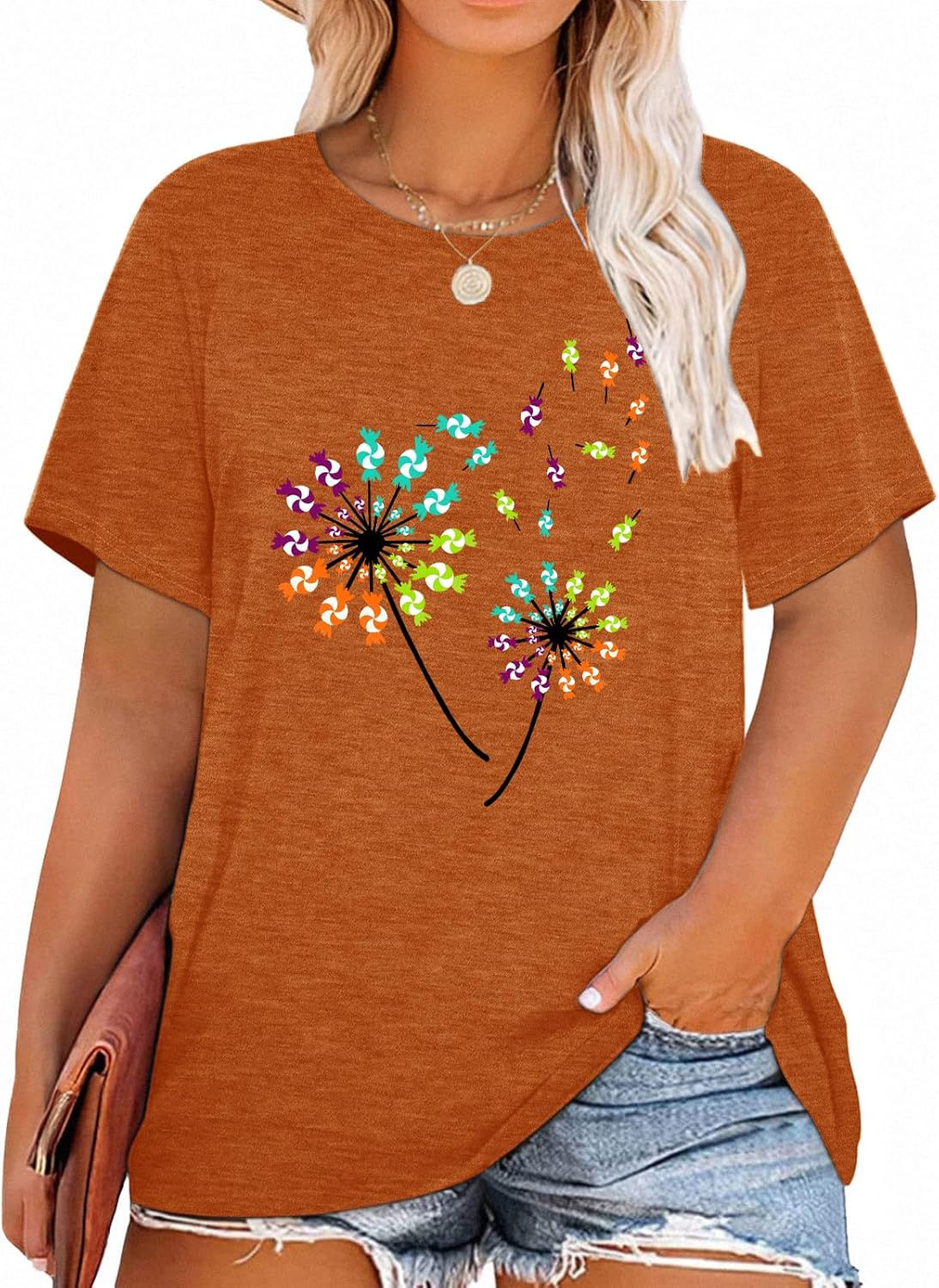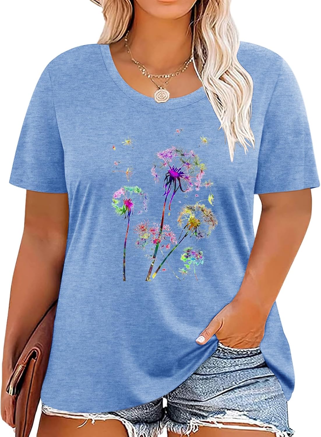 Womens Plus Size Dandelion Print Tshirt Cute Graphic Floral Tees Short Sleeve Summer Blessed Tee Tops