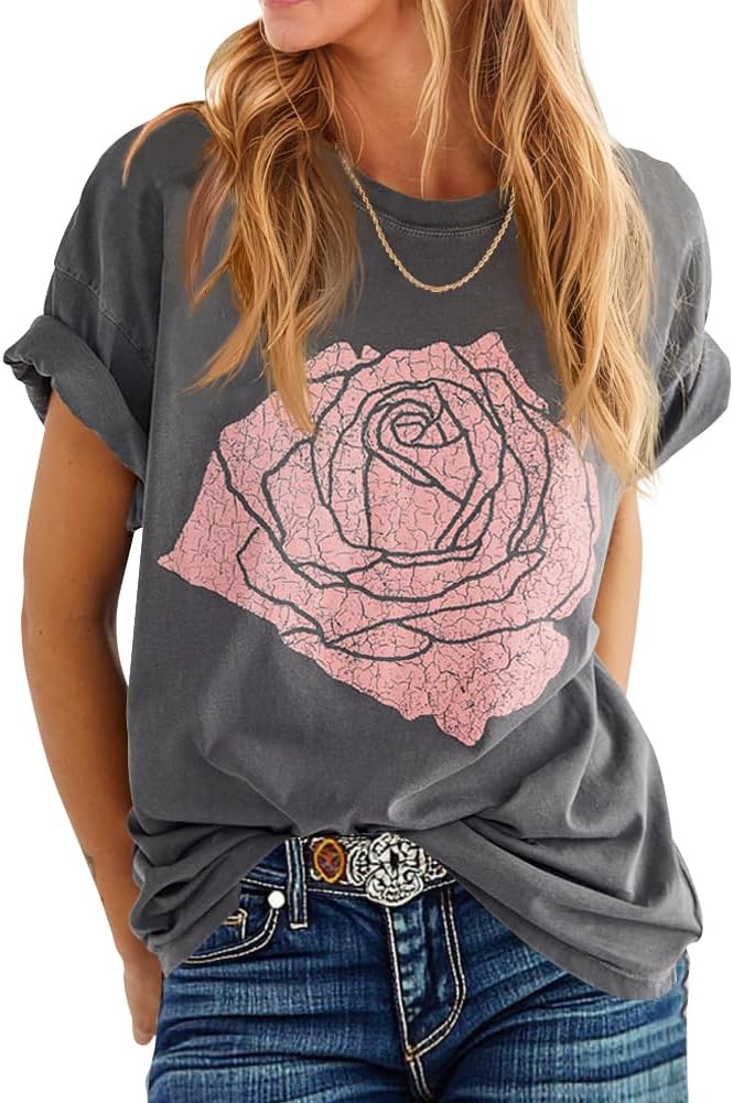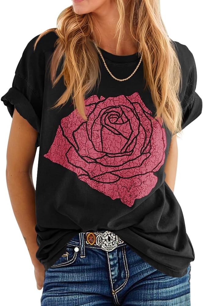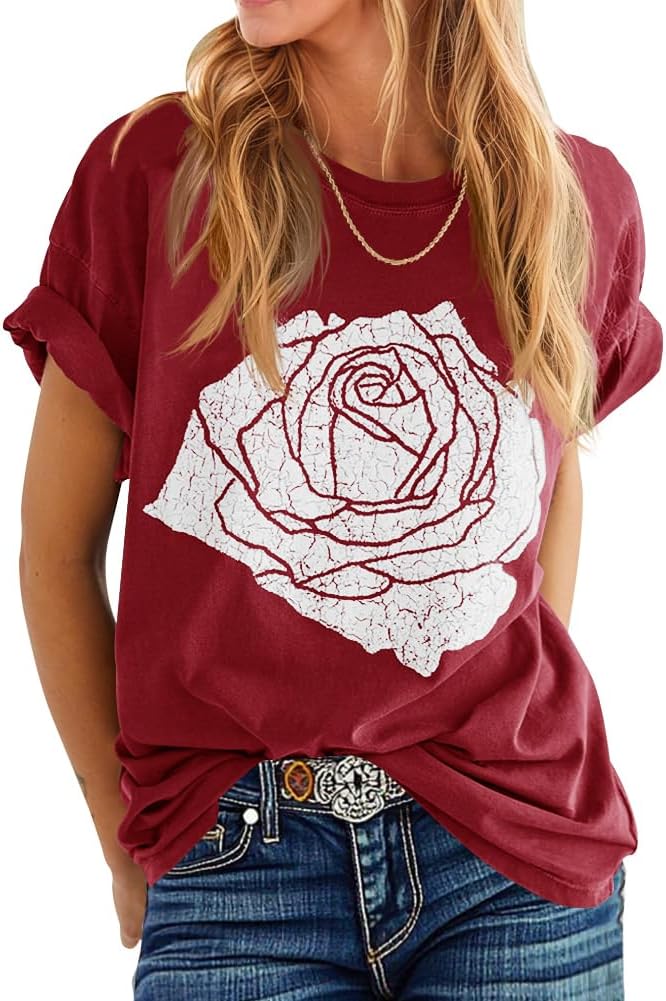 Womens Rose Graphic Tee T Shirt Loose Fit Summer Short Sleeve Casual Boyfriend Crew Neck Tops